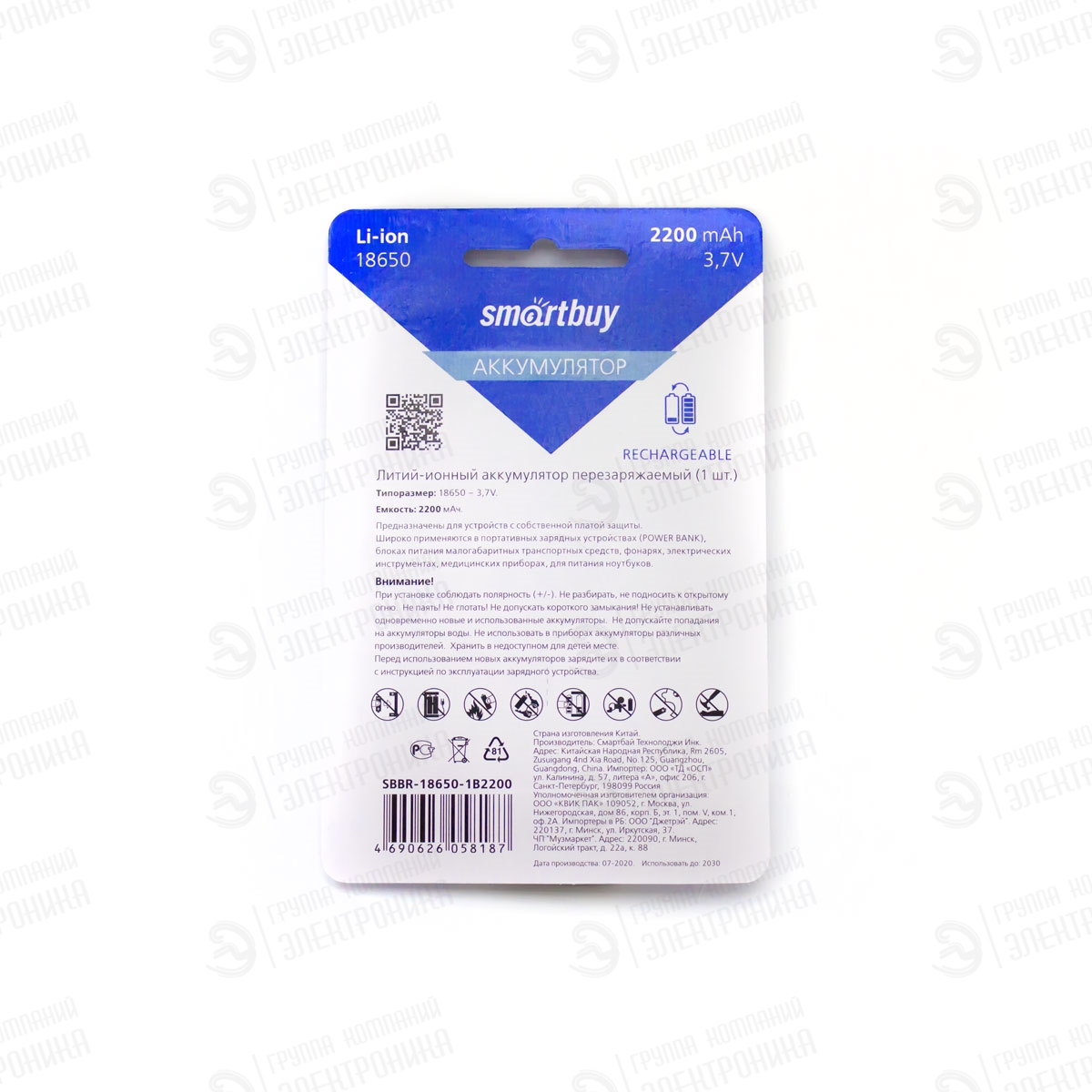 Аккумулятор литиевый 3,7В 2200mA 18650 LiR SBBR-18650-1B2200 Smartbuy