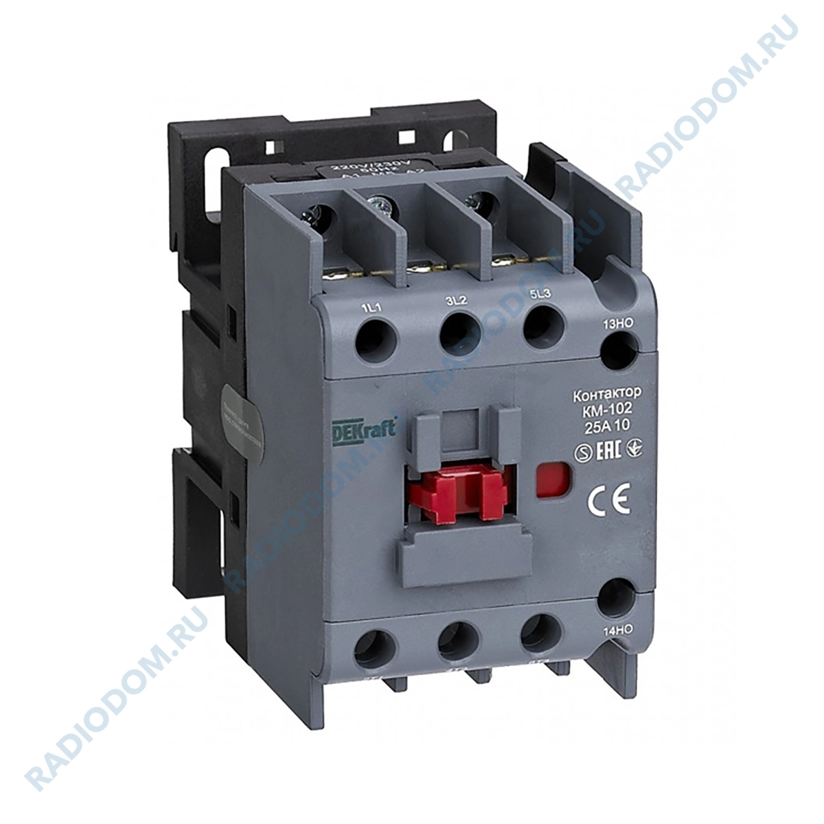 Контактор серии КМ-102 Dekraft; 3P; номинальный ток 25 А (AC3, AC4); напряжение управления 220 В пер.тока; доп.контакты 1НО; установка на стандартную DIN-рейку. Контакторы КМ-102 предназначены для пуска и останова асинхронных двигателей, для коммутации осветительных сетей и конденсаторных батарей в сетях напряжением до 690 В пер.тока. Дополнительные защитные крышки исключают попадание пыли внутрь контактора и обеспечивают защиту от случайного прикосновения.