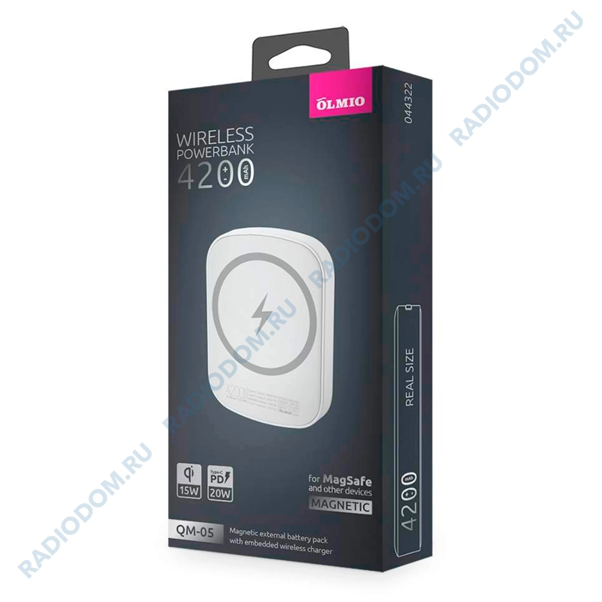 Беспроводной магнитный внешний аккумулятор Olmio QM-05 предназначен для зарядки смартфонов и других устройств. Основным его преимуществом является магнитная площадка, совместимая с устройствами Apple MagSafe