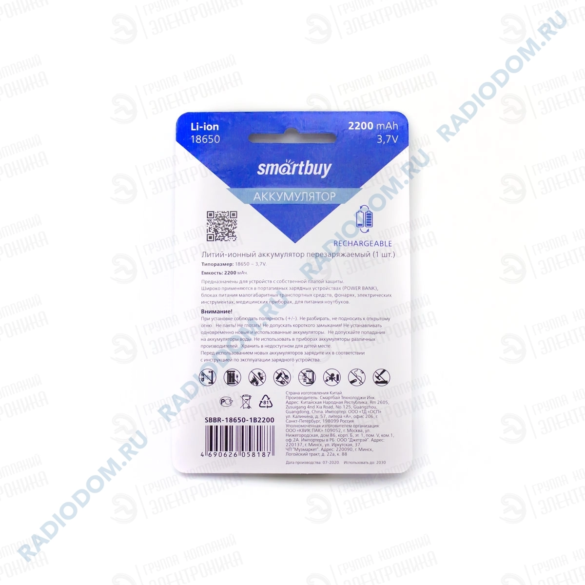 Аккумулятор литиевый 3,7В 2200mA 18650 LiR SBBR-18650-1B2200 Smartbuy