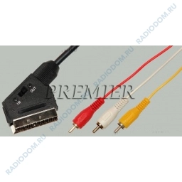 Аудио-видео кабель SCART-3RCA SVHS для передачи аналогового видеосигнала (желтый тюльпан) и 2-х канального аудио (красный и белый тюльпан). Переключатель на корпусе служит для изменения направления прохождения сигнала.