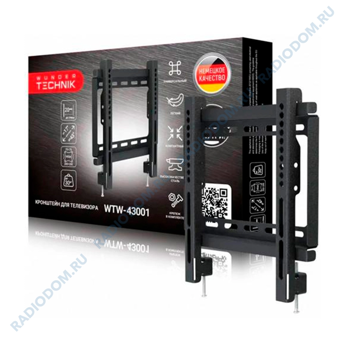 Настенный кронштейн WTW-43001. Предназначен для моделей с диагональю от 17 до 43. Конструция кронштейна предназначенна для крепленя на стену. В комплекте с кронштейном поставляются все необходимые универсальные крепления. Материал - Сталь Цвет -Черный Вес - 0,45