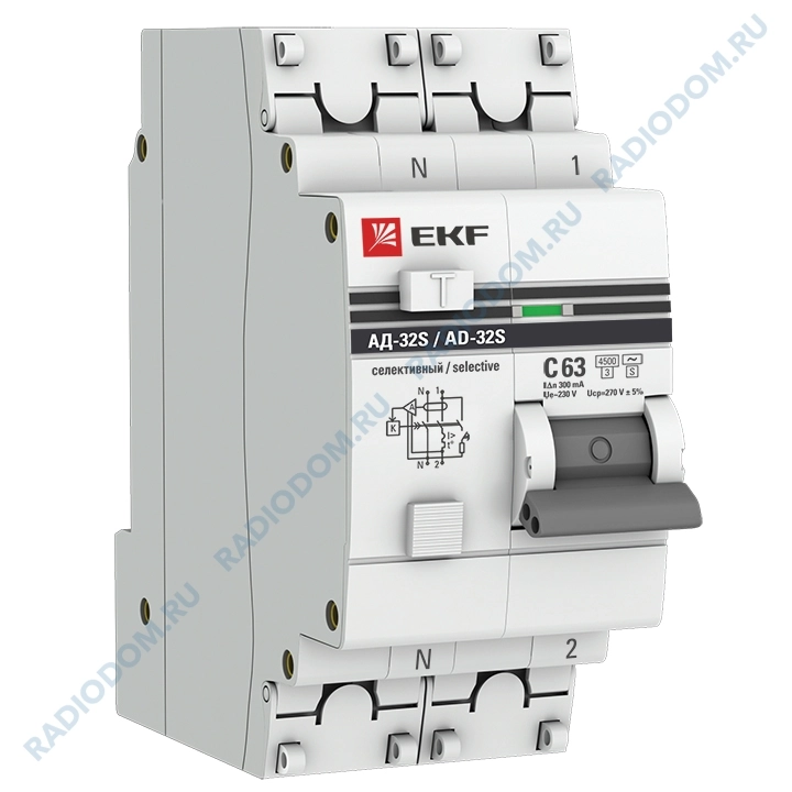 Дифференциальный автомат АД-32S (селективный) 1P+N, 63А/300мА тип (АС) эл. 4,5кА EKF PROxima