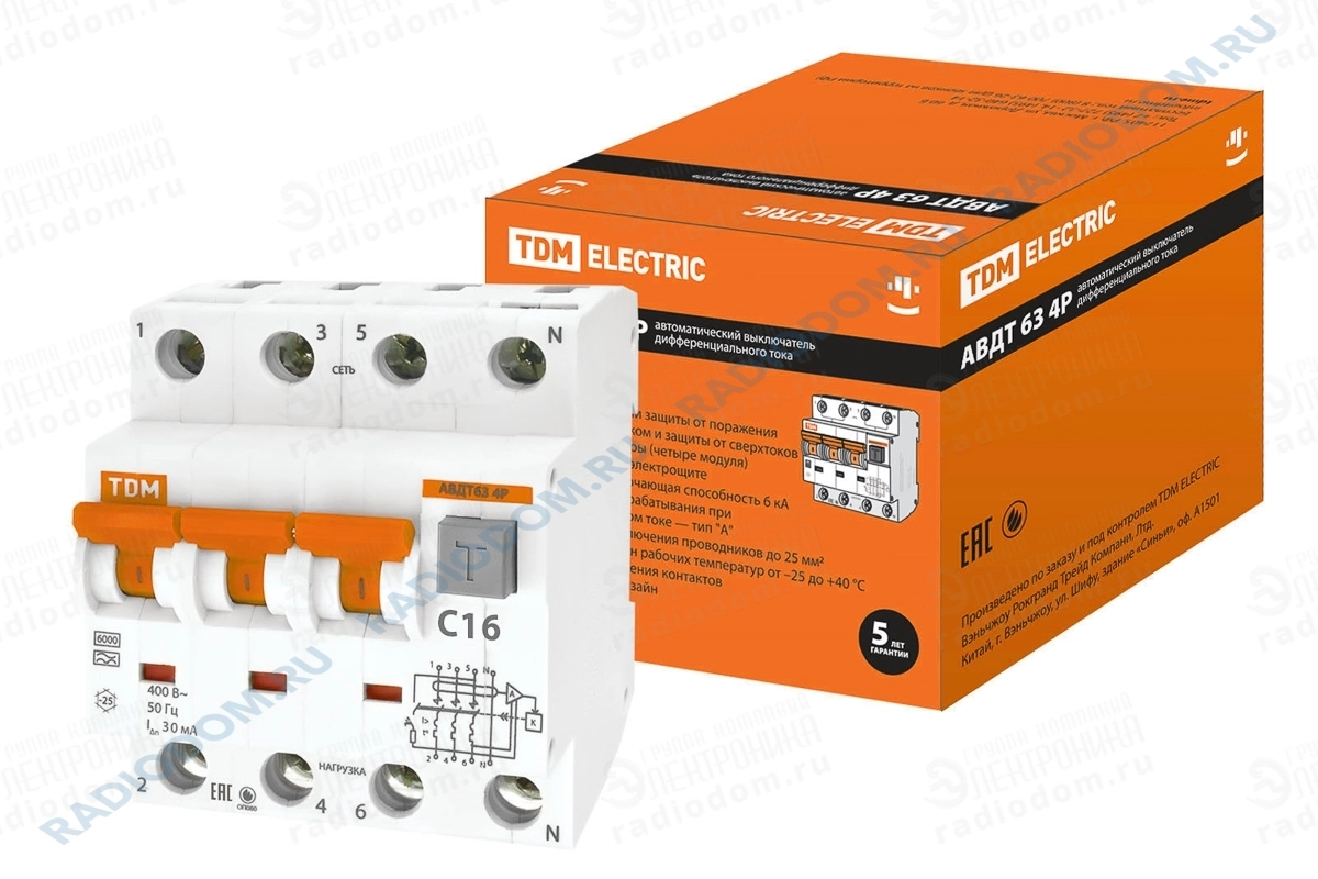 Автоматический выключатель дифференциального тока 4Р 16А 30мА АВДТ63 х-ка С TDM ELECTRIC