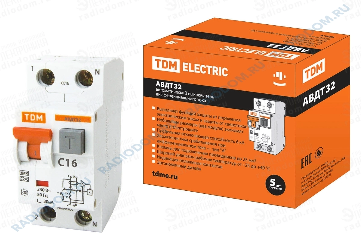 Автоматический выключатель дифф. тока 2P 16А 30мА АВДТ32 х-ка C