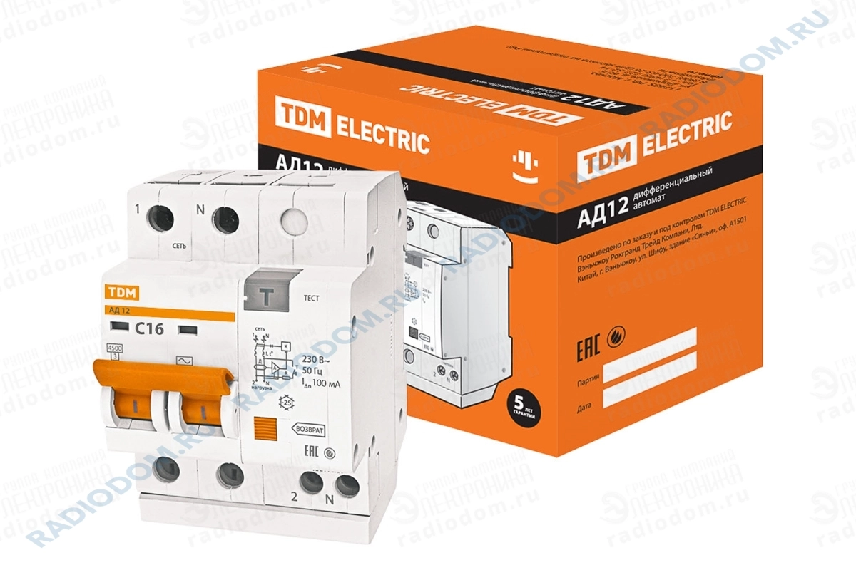 Автоматический выключатель дифференциального тока 2P 16A 100мА АД12 х-ка С TDM ELECTRIC