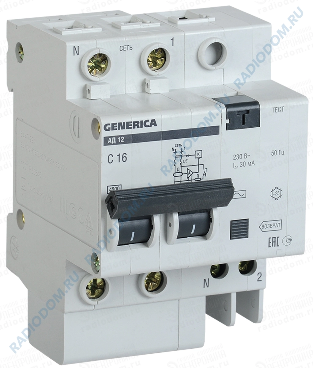 Автоматический выключатель дифференциального тока 2P 50А 30мА АД12 х-ка C Generica iEK