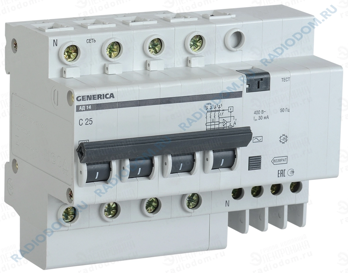 Автоматический выключатель дифференциального тока 4P 50А 30мА АД14 х-ка C Generica iEK