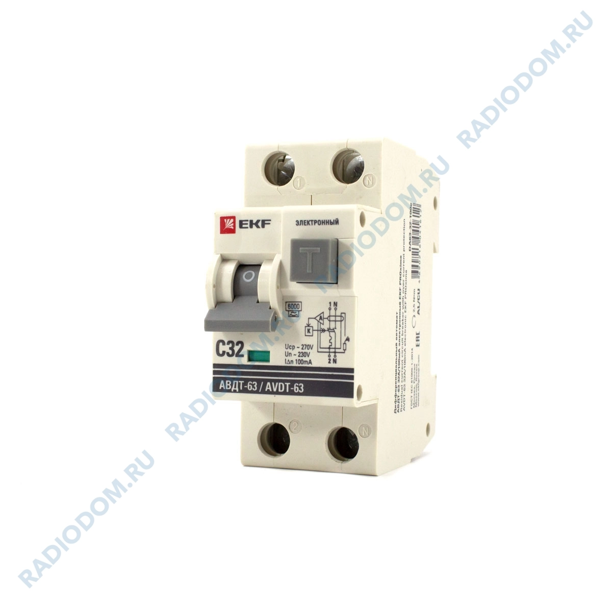 Дифференциальный автоматический выключатель АВДТ-63 совмещает в себе автоматический выключатель и УЗО (устройство защитного отключения). Устройство надежно защищает подключенные электроприборы от тока утечки, перенапряжения и короткого замыкания. При обнаружении неисправности автомат отключит подачу электричества на защищаемый участок цепи. Рабочий ток 32 А. Срабатывание при дифференциальном значении 100 мА.. Ширина равна 2 модулям. Глубина установки 46 мм. Возможна коммутация медным и алюминиевым проводником. Общее количество полюсов – 2. Гарантия от производителя 7 лет