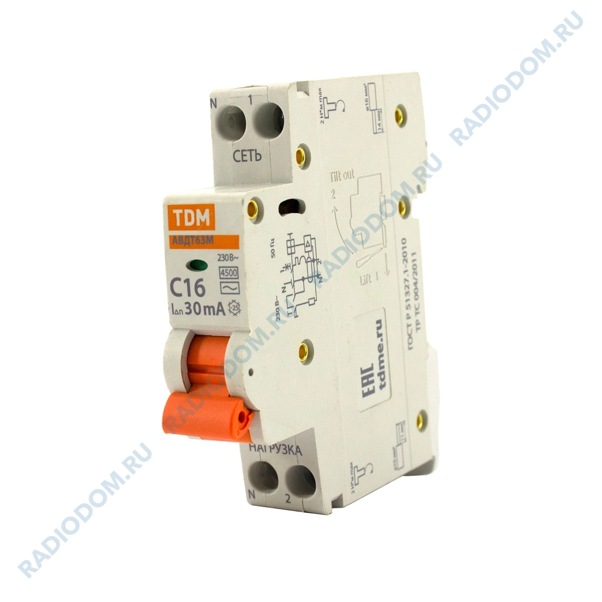 Автоматический выключатель дифференциального тока 1P 16A 30мА АВДТ63М х-ка С TDM ELECTRIC