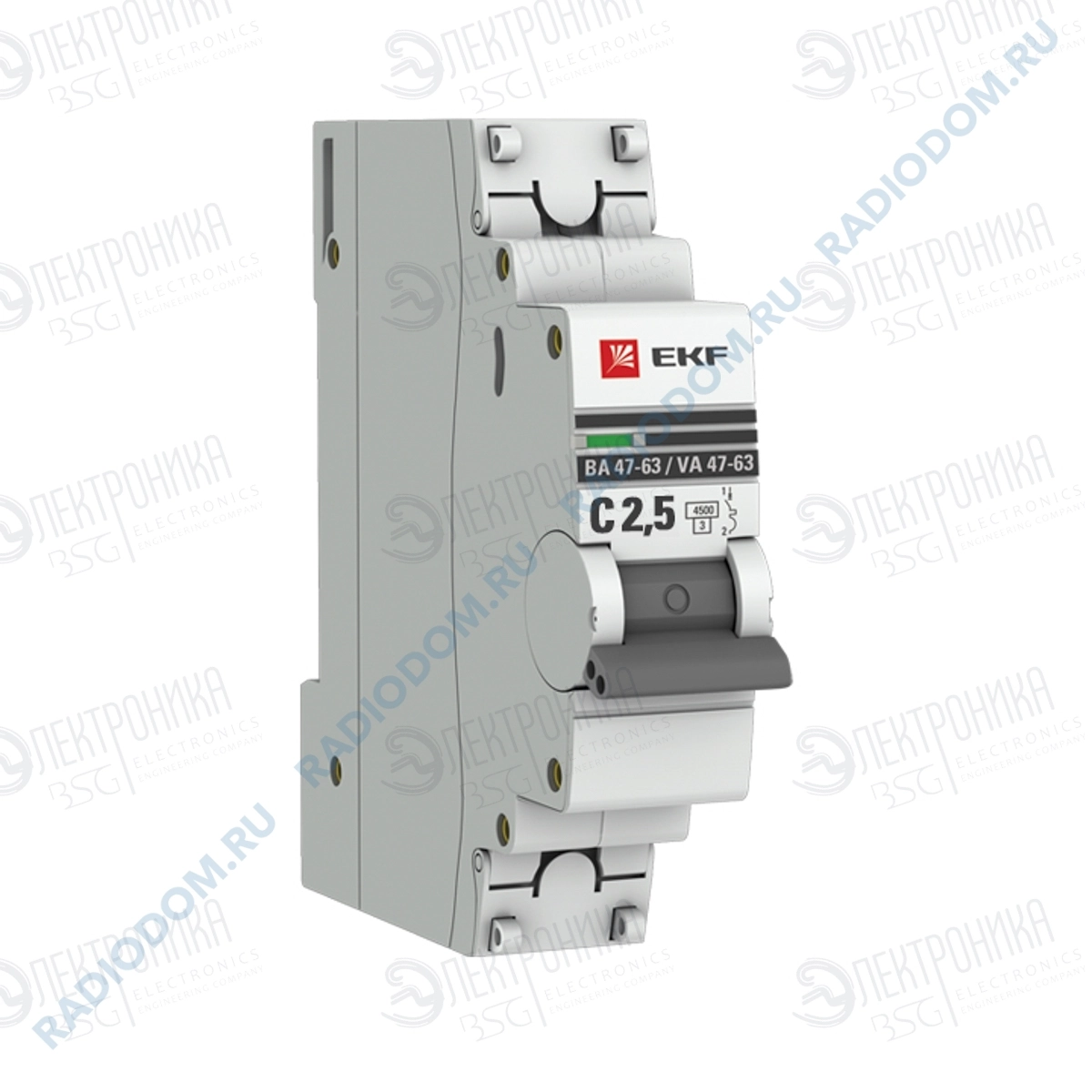 Автоматический выключатель ВА 47-63 механическое коммутационное устройство, предназначенное для включения (отключения) электрической цепи, а также защиты от короткого замыкания и перенапряжения. В выключателях имеются пластиковые крышки, закрывающие доступ к винтовому зажиму и служащие для опломбирования выключателей, что исключает несанкционированный доступ к проводникам. Корпус выключателей усилен дополнительными заклепками для устранения эффекта расхождения корпуса. Рабочий ток 2,5 А. Ширина равна 1 модулю. Глубина установки 50 мм. Возможна коммутация медным и алюминиевым проводником. Максимальное сечение подключаемого кабеля 25 мм2. Номинальная отключающая способность 4,5 кА. Общее количество полюсов – 1. Гарантия от производителя 5 лет.