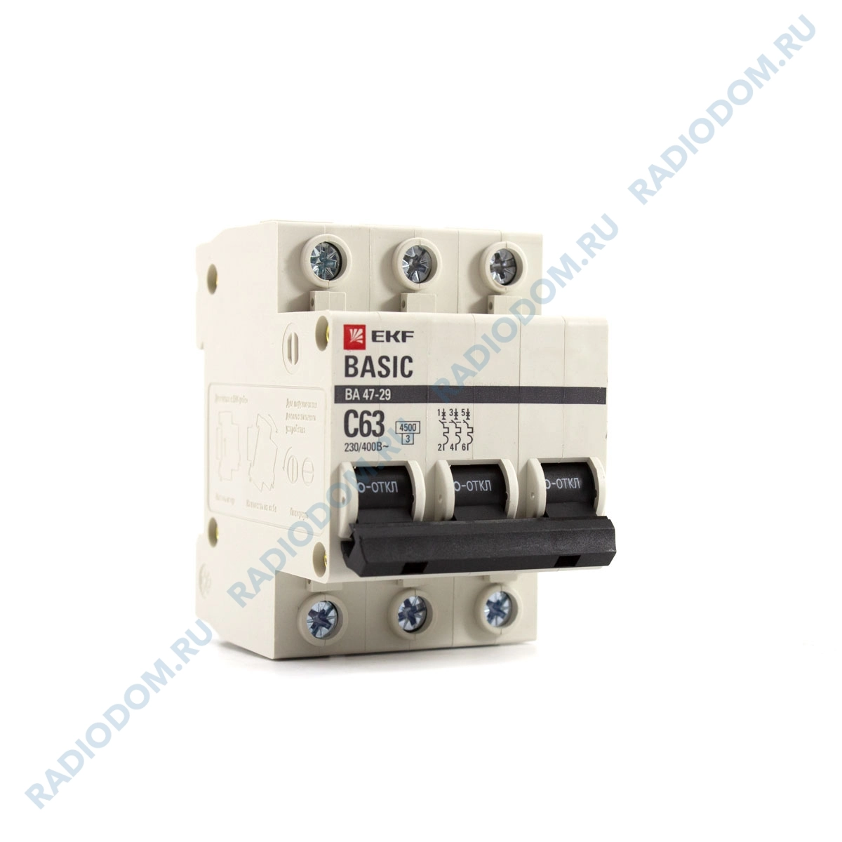 Автоматический выключатель ВА 47-29 механическое коммутационное устройство, предназначенное для включения (отключения) электрической цепи, а также защиты от короткого замыкания и перенапряжения. В выключателях имеются пластиковые крышки, закрывающие доступ к винтовому зажиму и служащие для опломбирования выключателей, что исключает несанкционированный доступ к проводникам. Корпус выключателей усилен дополнительными заклепками для устранения эффекта расхождения корпуса. Рабочий ток 63 А. Ширина равна 3 модулям. Глубина установки 50 мм. Возможна коммутация медным и алюминиевым проводником. Максимальное сечение подключаемого кабеля 25 мм2. Номинальная отключающая способность 4,5 кА. Общее количество полюсов – 3. Гарантия от производителя 3 года.