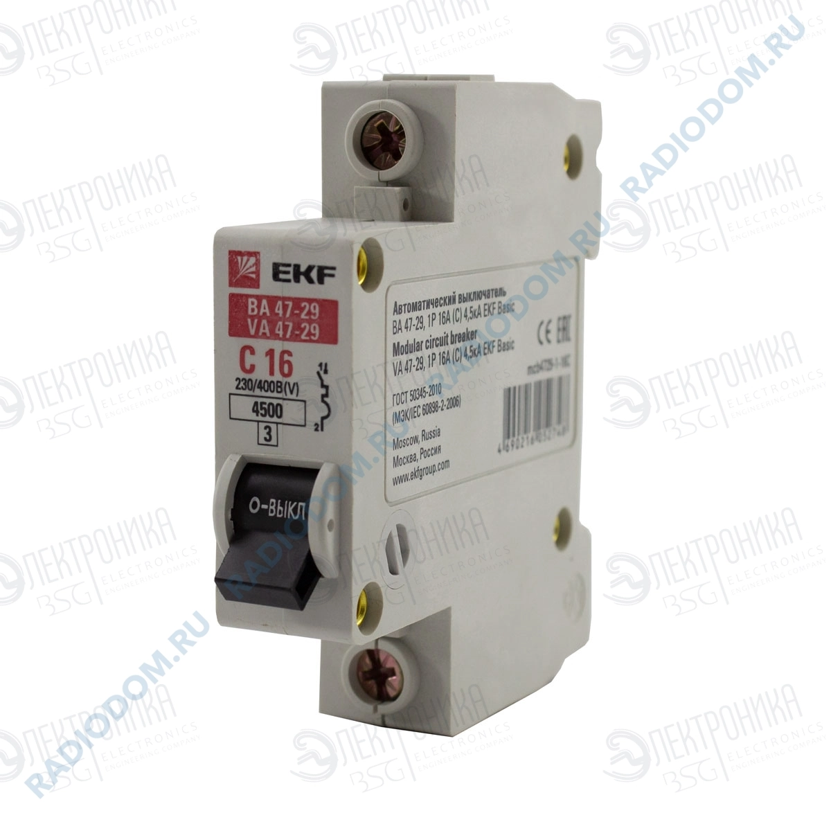 Автоматический выключатель ВА 47-29 механическое коммутационное устройство, предназначенное для включения (отключения) электрической цепи, а также защиты от короткого замыкания и перенапряжения. В выключателях имеются пластиковые крышки, закрывающие доступ к винтовому зажиму и служащие для опломбирования выключателей, что исключает несанкционированный доступ к проводникам. Корпус выключателей усилен дополнительными заклепками для устранения эффекта расхождения корпуса. Рабочий ток 16А. Ширина равна 1 модулю. Глубина установки 50 мм. Возможна коммутация медным и алюминиевым проводником. Максимальное сечение подключаемого кабеля 25 мм2. Номинальная отключающая способность 4,5 кА. Общее количество полюсов – 1. Гарантия от производителя 3 года.