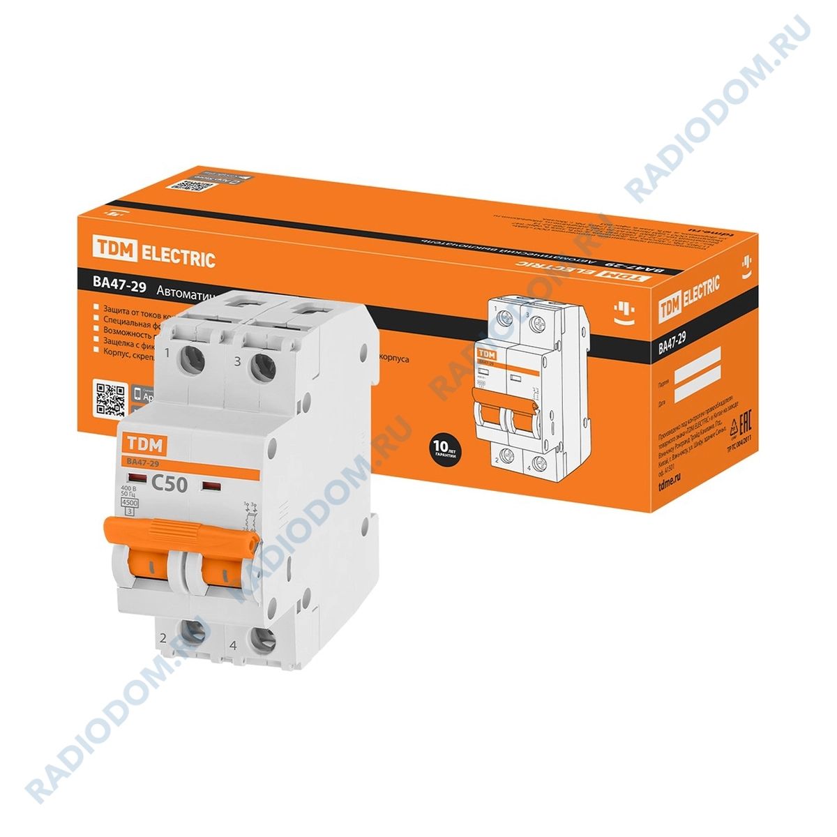 Автоматический выключатель 2P 50A (C) ВА47-29 4,5кА TDM