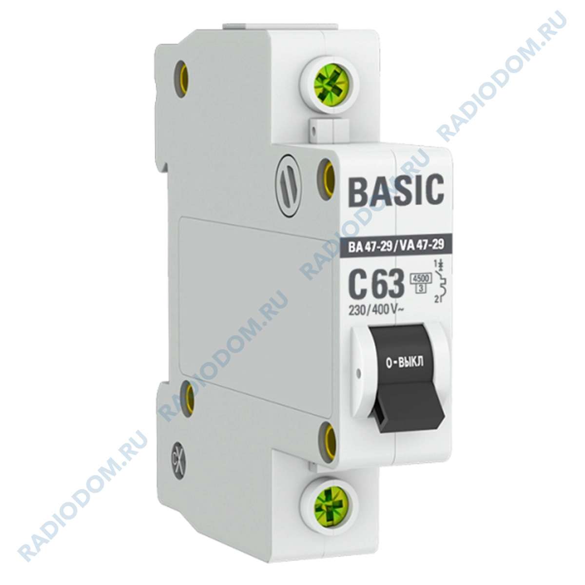 Автоматический выключатель ВА 47-29 механическое коммутационное устройство, предназначенное для включения (отключения) электрической цепи, а также защиты от короткого замыкания и перенапряжения. В выключателях имеются пластиковые крышки, закрывающие доступ к винтовому зажиму и служащие для опломбирования выключателей, что исключает несанкционированный доступ к проводникам. Корпус выключателей усилен дополнительными заклепками для устранения эффекта расхождения корпуса. Рабочий ток 63 А. Ширина равна 1 модулю. Глубина установки 50 мм. Возможна коммутация медным и алюминиевым проводником. Максимальное сечение подключаемого кабеля 25 мм2. Номинальная отключающая способность 4,5 кА. Общее количество полюсов – 1. Гарантия от производителя 5 лет.
