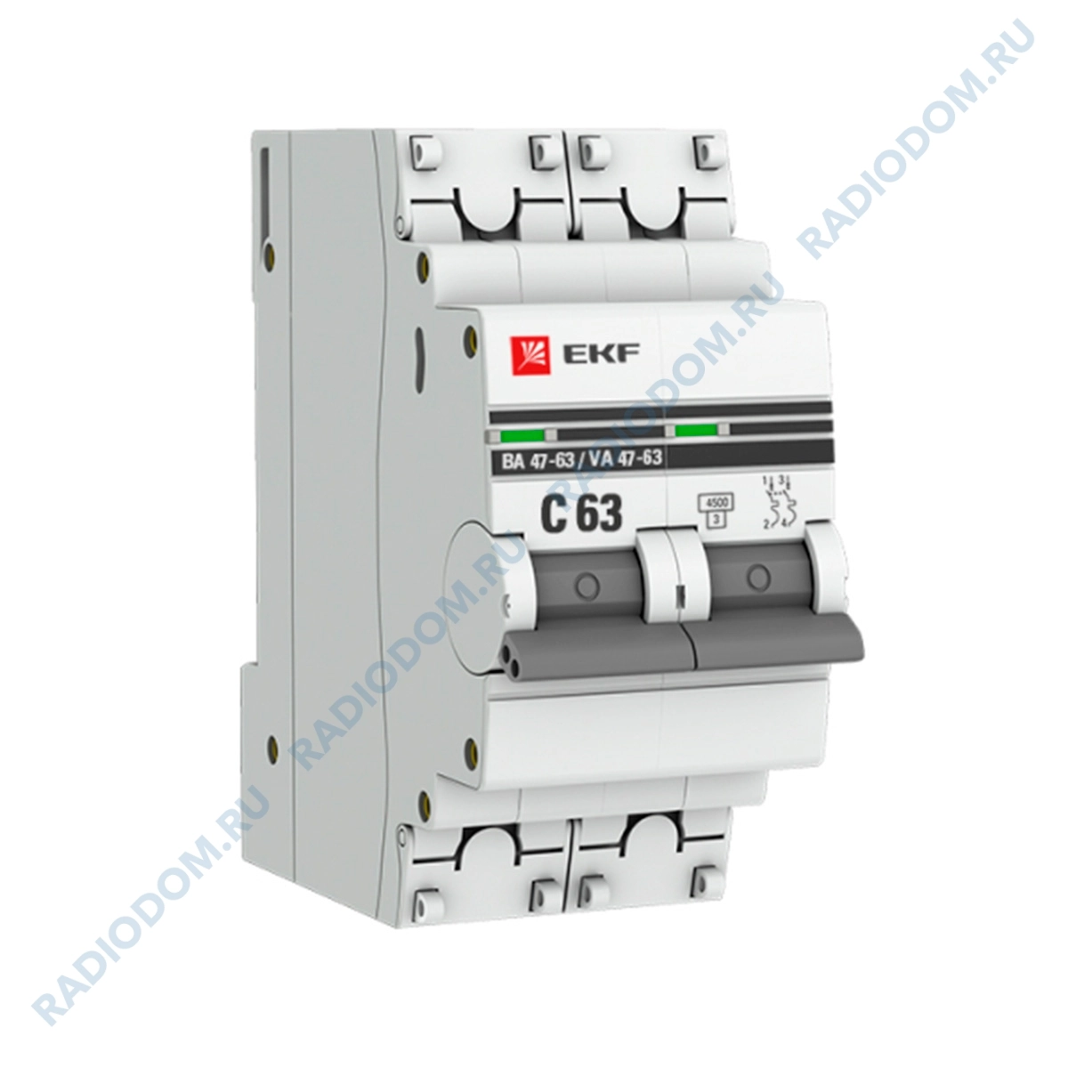 Автоматический выключатель ВА 47-63 механическое коммутационное устройство, предназначенное для включения (отключения) электрической цепи, а также защиты от короткого замыкания и перенапряжения. В выключателях имеются пластиковые крышки, закрывающие доступ к винтовому зажиму и служащие для опломбирования выключателей, что исключает несанкционированный доступ к проводникам. Корпус выключателей усилен дополнительными заклепками для устранения эффекта расхождения корпуса. Рабочий ток 63 А. Ширина равна 2 модулям. Глубина установки 50 мм. Возможна коммутация медным и алюминиевым проводником. Максимальное сечение подключаемого кабеля 25 мм2. Номинальная отключающая способность 4,5 кА. Общее количество полюсов – 2. Гарантия от производителя 7 лет.