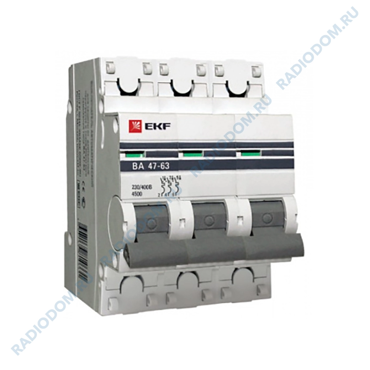 Автоматический выключатель ВА 47-63 механическое коммутационное устройство, предназначенное для включения (отключения) электрической цепи, а также защиты от короткого замыкания и перенапряжения. В выключателях имеются пластиковые крышки, закрывающие доступ к винтовому зажиму и служащие для опломбирования выключателей, что исключает несанкционированный доступ к проводникам. Корпус выключателей усилен дополнительными заклепками для устранения эффекта расхождения корпуса. Рабочий ток 13 А. Ширина равна 3 модулям. Глубина установки 50 мм. Возможна коммутация медным и алюминиевым проводником. Максимальное сечение подключаемого кабеля 25 мм2. Номинальная отключающая способность 4,5 кА. Общее количество полюсов – 3. Гарантия от производителя 5 лет.