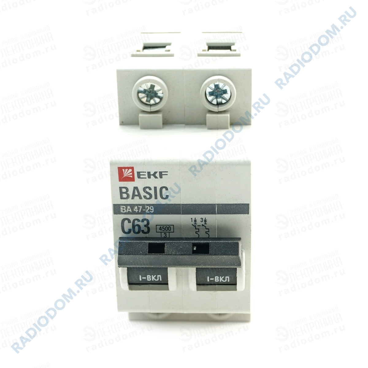 Автоматический выключатель ВА 47-29 механическое коммутационное устройство, предназначенное для включения (отключения) электрической цепи, а также защиты от короткого замыкания и перенапряжения. В выключателях имеются пластиковые крышки, закрывающие доступ к винтовому зажиму и служащие для опломбирования выключателей, что исключает несанкционированный доступ к проводникам. Корпус выключателей усилен дополнительными заклепками для устранения эффекта расхождения корпуса. Рабочий ток 63 А. Ширина равна 2 модулям. Глубина установки 50 мм. Возможна коммутация медным и алюминиевым проводником. Максимальное сечение подключаемого кабеля 25 мм2. Номинальная отключающая способность 4,5 кА. Общее количество полюсов – 2. Гарантия от производителя 3 года.