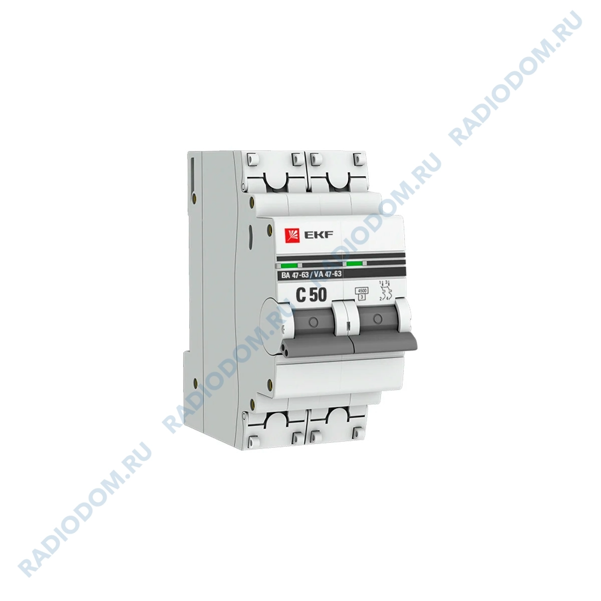 Автоматический выключатель ВА 47-63 механическое коммутационное устройство, предназначенное для включения (отключения) электрической цепи, а также защиты от короткого замыкания и перенапряжения. В выключателях имеются пластиковые крышки, закрывающие доступ к винтовому зажиму и служащие для опломбирования выключателей, что исключает несанкционированный доступ к проводникам. Корпус выключателей усилен дополнительными заклепками для устранения эффекта расхождения корпуса. Рабочий ток 50 А. Ширина равна 2 модулям. Глубина установки 50 мм. Возможна коммутация медным и алюминиевым проводником. Максимальное сечение подключаемого кабеля 25 мм2. Номинальная отключающая способность 4,5 кА. Общее количество полюсов – 2. Гарантия от производителя 5 лет.