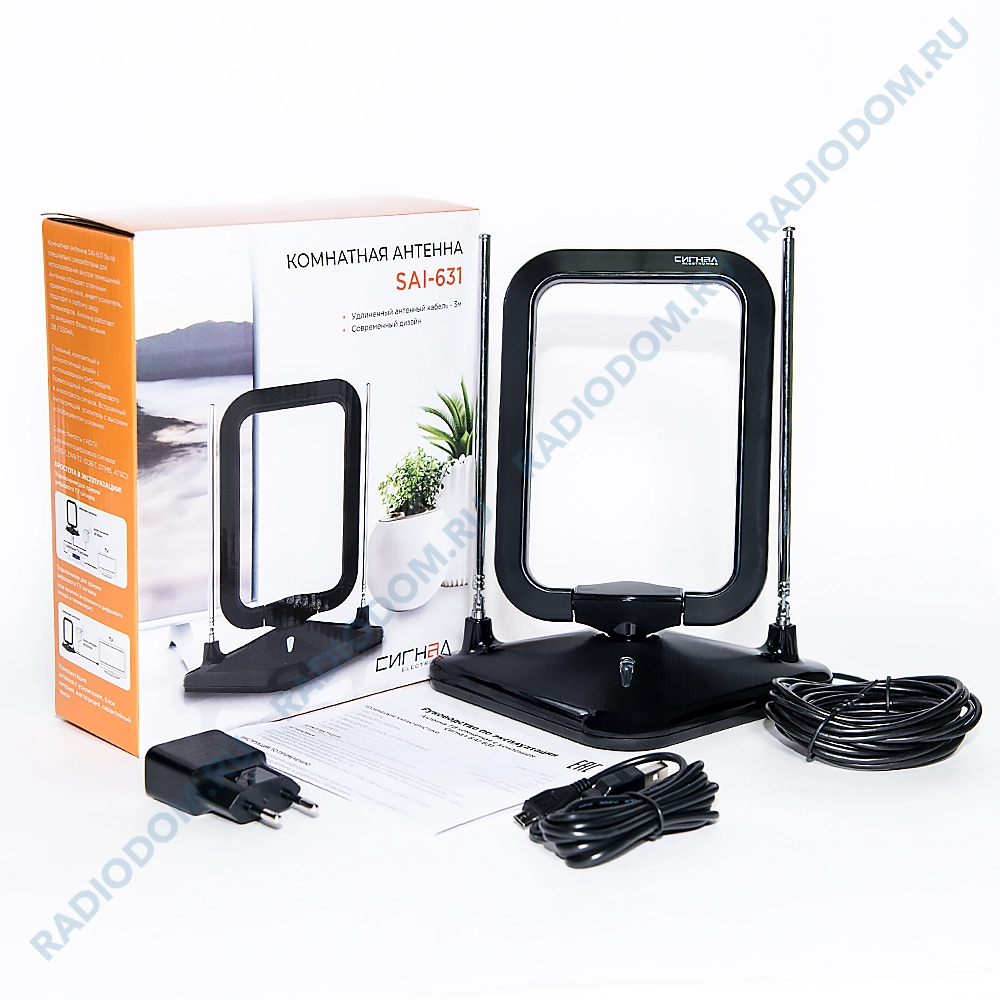 В комплектацию входит: антенна «Сигнал» SAI-631, блок питания, инструкция полностью на русском языке, гарантийный талон и красочная упаковка