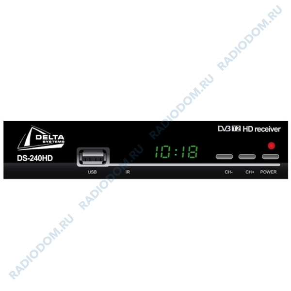 Цифровой телевизионный приемник Delta Systems DS-240HD позволяет принимать цифровые каналы эфирного телевидения в стандарте DVB-T2. Подключение телевизоров возможно через разъемы HDMI и RCA. Кнопки управления на лицевой панели позволят не бояться потери пульта. Приемник можно использовать как медиаплеер для USB флешек и смотреть фильмы и фото, слушать музыку. У приемника встроенный блок питания и металлический корпус, есть дисплей, а комплектация помимо прочего включает кабель RCA, пульт ДУ и элементы питания к нему.