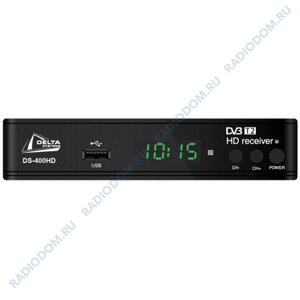 Цифровой телевизионный приемник Delta Systems DS-400HD позволяет принимать цифровые каналы эфирного телевидения в стандарте DVB-T2. Подключение телевизоров возможно через разъемы HDMI и RCA. Кнопки управления на лицевой панели позволят не бояться потери пульта. Приемник можно использовать как медиаплеер для USB флешек и смотреть фильмы и фото, слушать музыку. У приемника внешний блок питания и пластиковый корпус, есть дисплей, а комплектация помимо прочего включает кабель RCA, пульт ДУ и батарейки к нему.