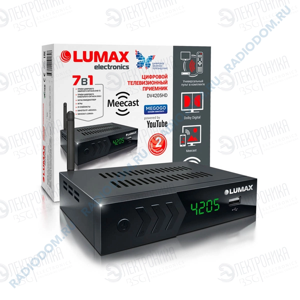 Цифровой телевизионный приемник Lumax DV-3205HD позволяет принимать цифровые каналы как эфирного телевидения в стандарте DVB-T2, так и кабельного телевидения стандарта DVB-C. Подключение телевизоров возможно через разъемы HDMI и RCA. Кнопки управления на лицевой панели позволят не бояться потери пульта. При приобретении дополнительной внешней антенны Wi-Fi открывается возможность смотреть YouTube и IPTV через встроенные приложения. Приемник можно использовать как медиаплеер для USB-накопителей и смотреть фильмы и фото, слушать музыку. У приемника встроенный блок питания и металлический корпус, есть дисплей, а комплектация помимо прочего включает кабель RCA, пульт ДУ и элементы питания к нему.