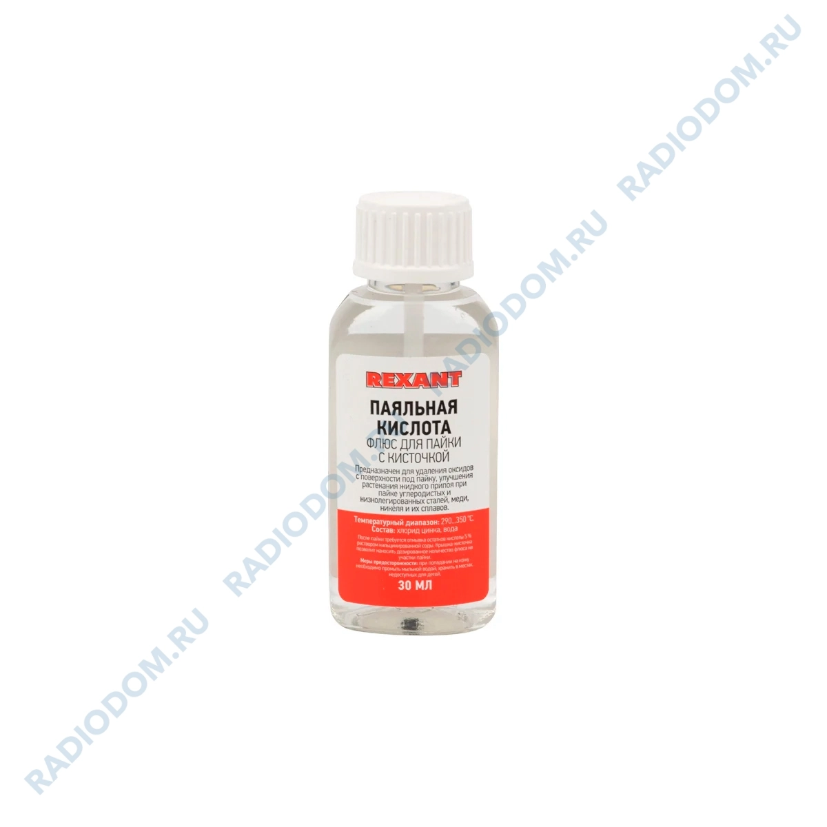 Флюс для пайки паяльная кислота 30 мл (с кисточкой) REXANT предназначен для удаления оксидов с поверхности под пайку, улучшения растекания жидкого припоя при пайке углеродистых и низколегированных сталей, меди, никеля и их сплавов. Это одно из самых распространенных средств для пайки.