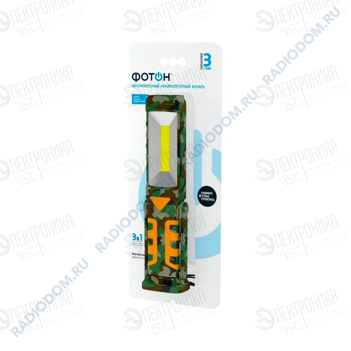 Автомобильный аккумуляторный светодиодный фонарь ФОТОН AU-500, камуфляж 24233 для работы в гаражах, мастерских или при вынужденном ремонте в пути. Обеспечивает яркий заполняющий свет. Поворотная конструкция позволяет изменять угол наклона фонаря для максимально удобного освещения. Магнитный держатель для крепления фонаря на металлической поверхности. Крюк для подвешивания. Направленный свет до 45 метров. Аварийный сигнал на оборотной стороне фонаря. Мощный рассеянный свет благодаря современному светодиоду 3 Вт.