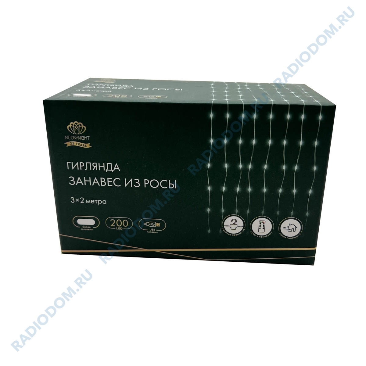 Гирлянда светодиодная 3,0x2,0м 300LED белая, провод прозрачный, свечение с динамикой, ''Дождь'' с контроллером 315-875 Неон-Найт
