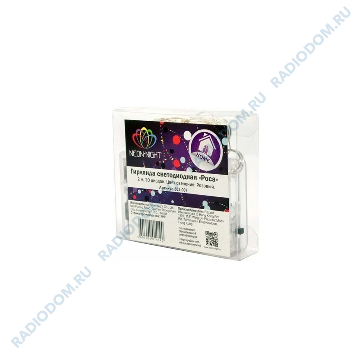 Гирлянда светодиодная 2м 20LED розовая, провод черный ''Роса'', питание 3xAA 303-007 Неон-Найт