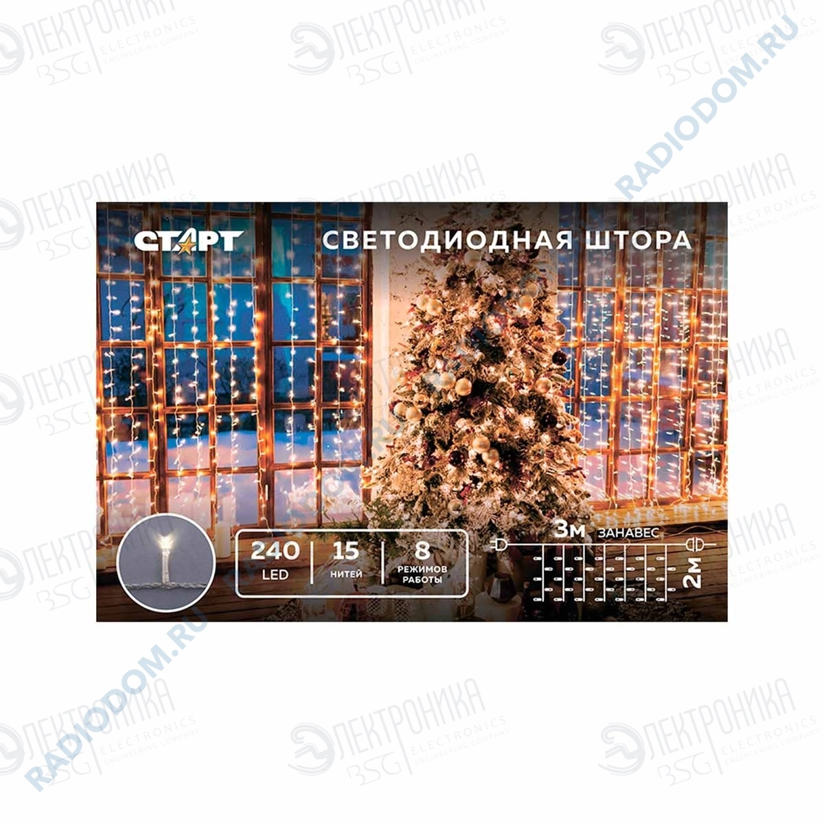 Электрогирлянда комнатная Старт нг занавес 3х2м 240 ламп теплый белый свет 8 режимов работы