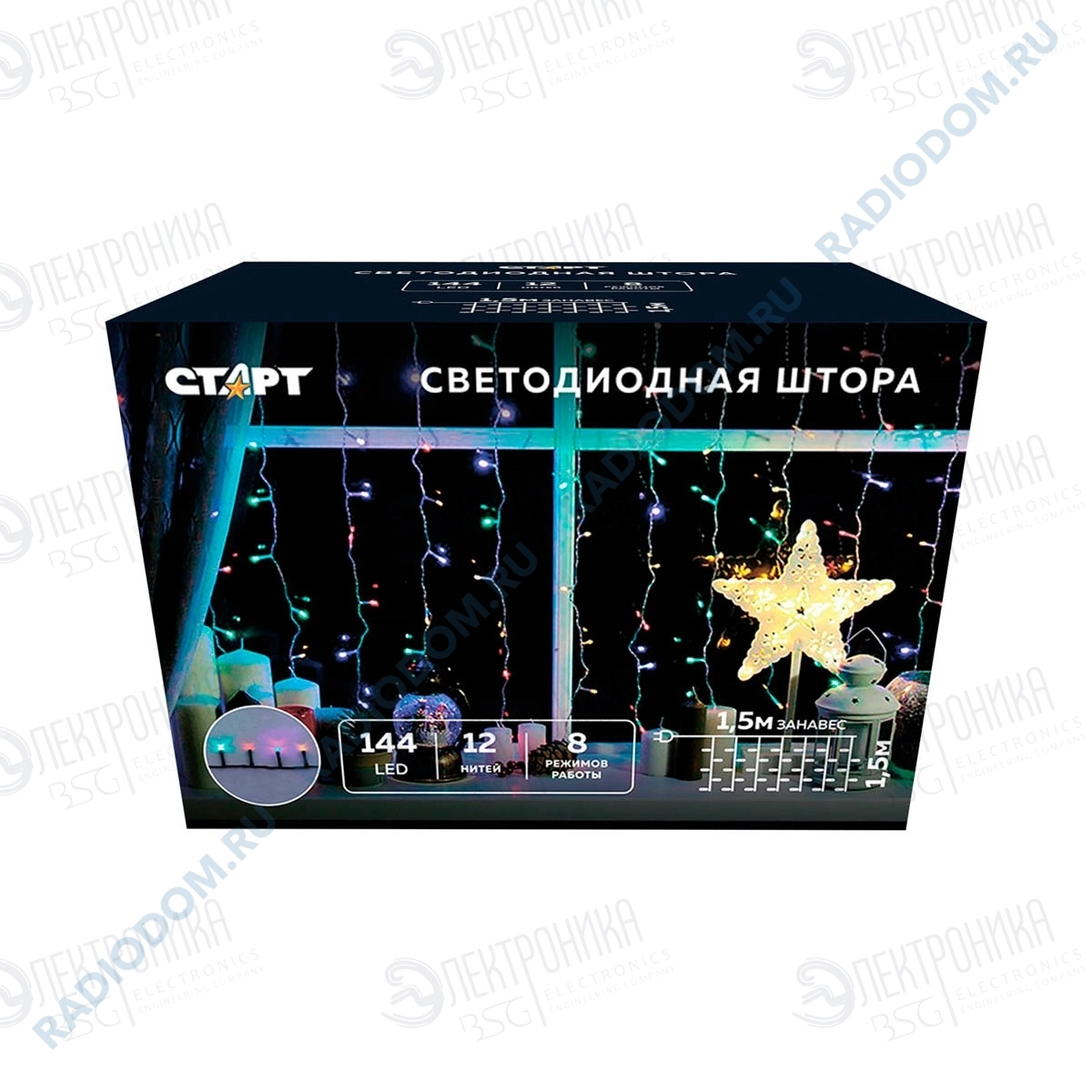 Электрогирлянда комнатная Старт нг занавес 1,5х1,5м 144 ламп теплый белый свет 8 режимов работы