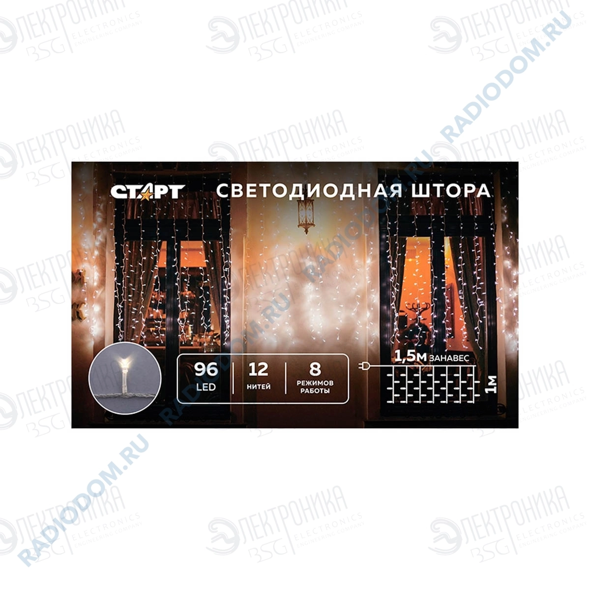 Электрогирлянда комнатная Старт нг занавес 1,5х1м 96 ламп теплый белый свет 8 режимов работы