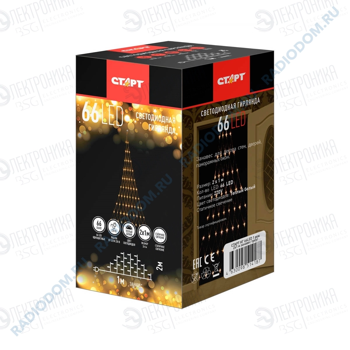Электрогирлянда комнатная Старт нг занавес 2х1м 66 ламп теплый белый свет 1 режим работы треугольная