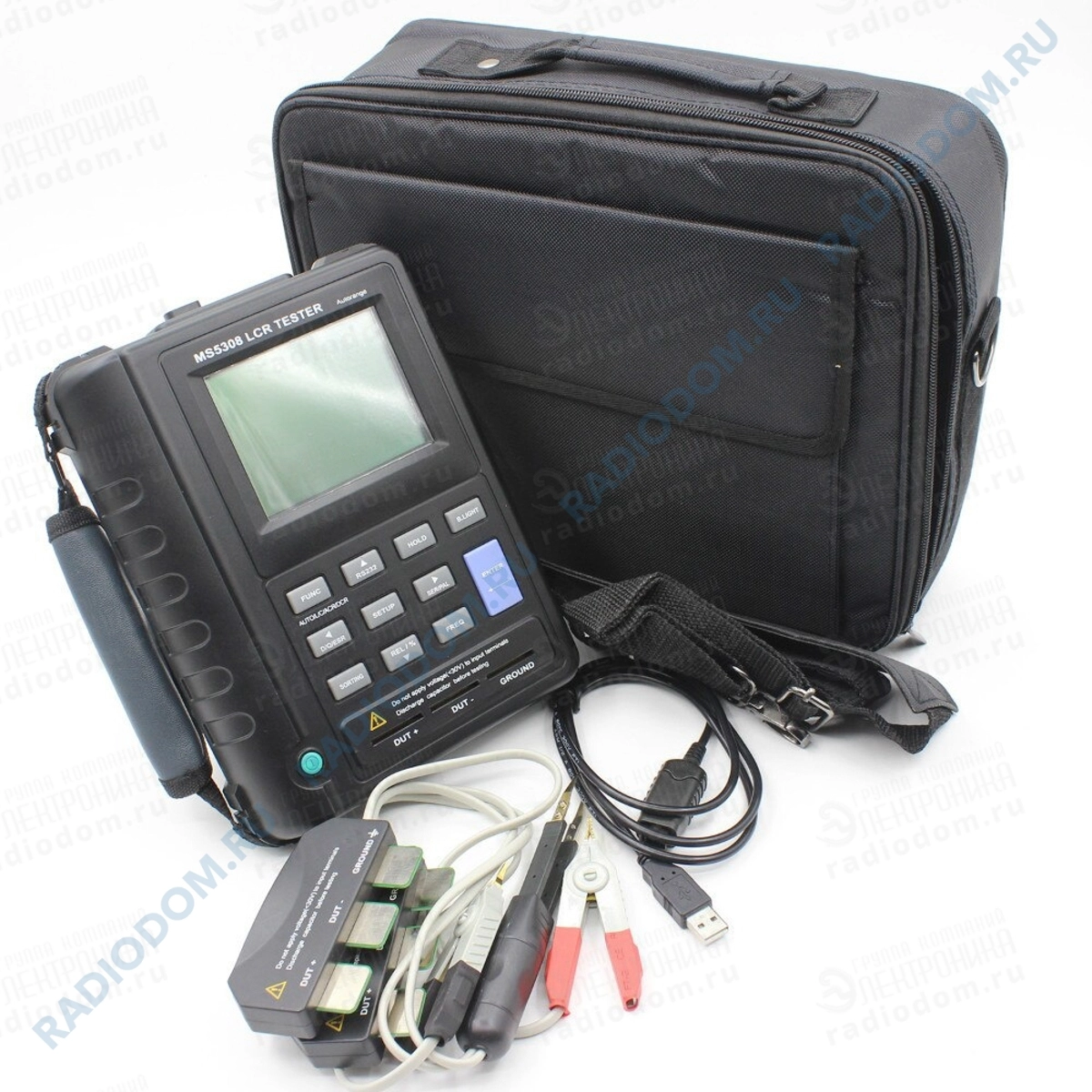 Измеритель иммитанса (RLC-метр) Mastech MS5308 вышел на смену легендарного RLC-измерителя Mastech MS530. В его основе лежит микропроцессорное управление, за счет чего прибор позволяет полностью измерения всех параметров RLC-цепей, включая значения добротности (Q)? тангенса угла потерь (D), угла сдвига фаз (Θ) и т.д. Данный КДС -измеритель может работать в цепях как постоянного тока, так и в цепях переменного тока, что делает этот прибор универсальным. Он полностью соответствует требованиям международного стандарта IEC1010-1 . Прибор имеет ЖК-дисплей с двойной цифровой и одной линейной индикацией значений с максимальным индицируемым числом 19999 (при измерении значений L,C,R) и 1999 (для измерений значений D, Q, Θ, ESR). Питание LCR-метра Mastech MS5308 осуществляется от 8-ми батарей 1,5В типа AA или от внешнего блока питания? который входит в комплект поставки . Прибор автоматически отключится через 5 минут после последних измерений. RLC-метр Mastech MS5308 имеет сертификат РосТеста.