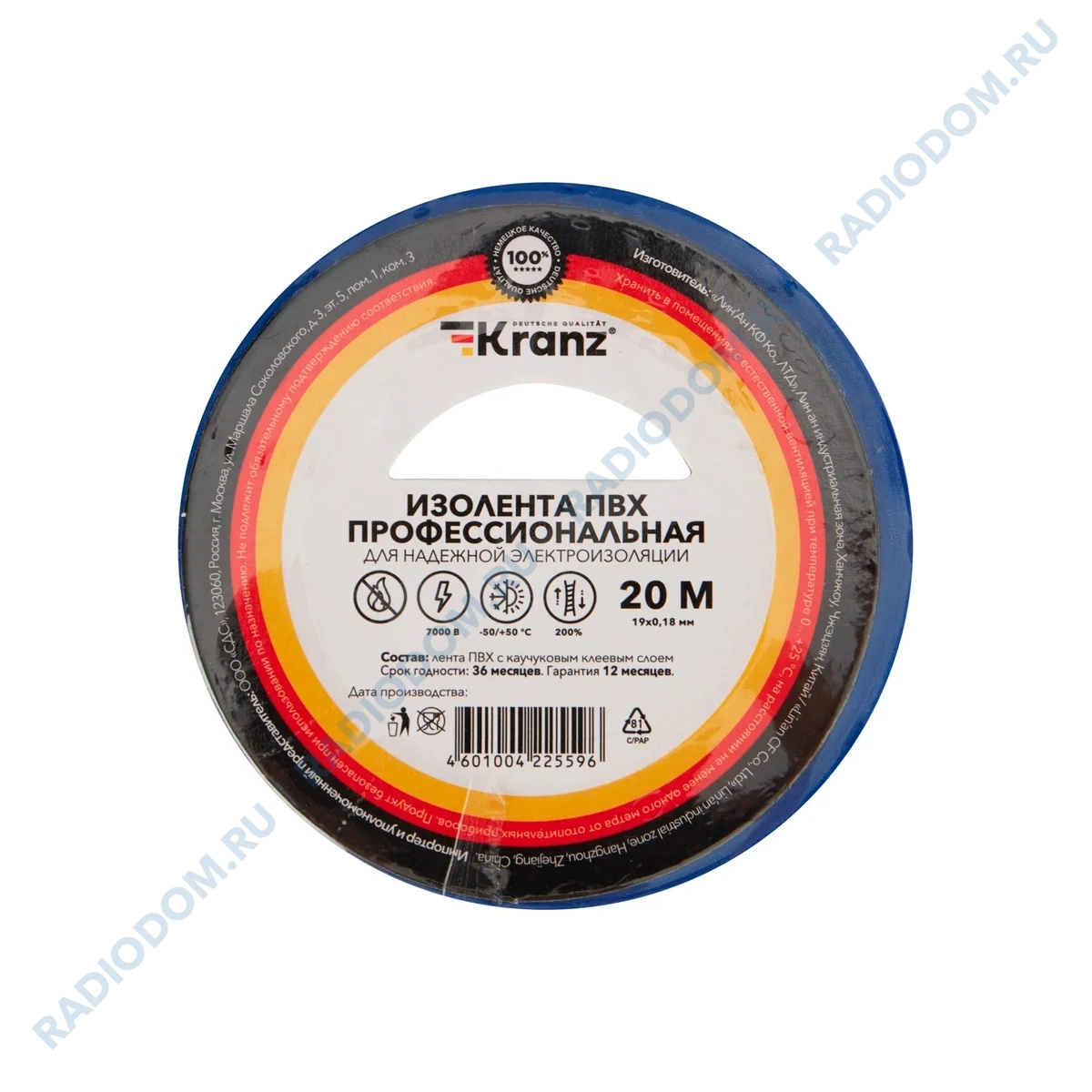 Изолента ПВХ 0,18ммх19ммх20м синяя Professional Kranz
