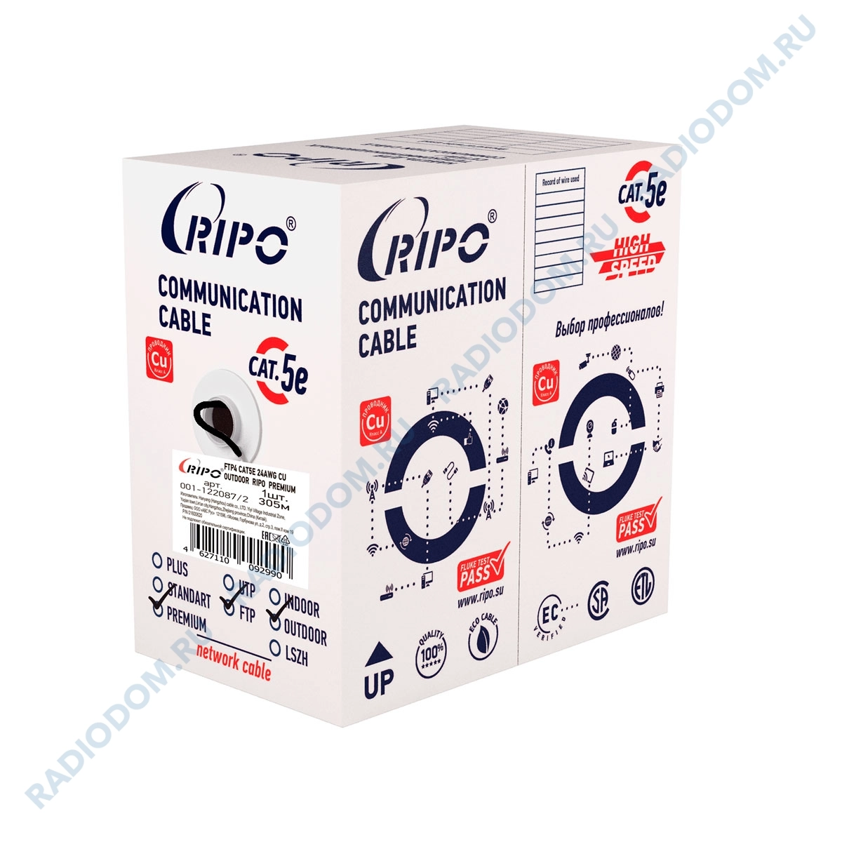 Кабель Ripo Premium FTP 4 пары (КСВППэ -5е 4*2*0.51), с экраном, Кат.5e (Класс D), 100МГц, одножильный, жила 0,51мм, BC (чистая медь), внешний, PE-полиэтилен, черный, Fluke test - pass, 305м