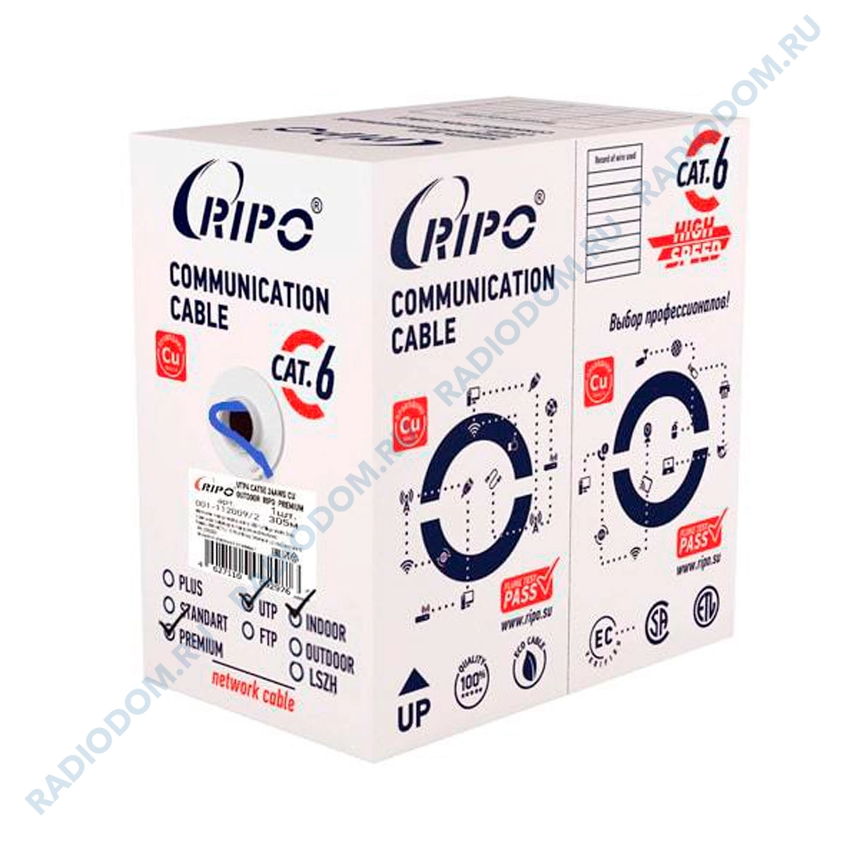 Кабель Ripo Premium UTP 4 пары (КСВПВ -6 4*2*0.58), Кат.6 (Класс E), 23AWG, 100МГц, одножильный, жила 0,58мм, BC (чистая медь), внутренний, PVC нг(B), синий, Fluke test - pass, 305м, Гарантия - 26 лет.