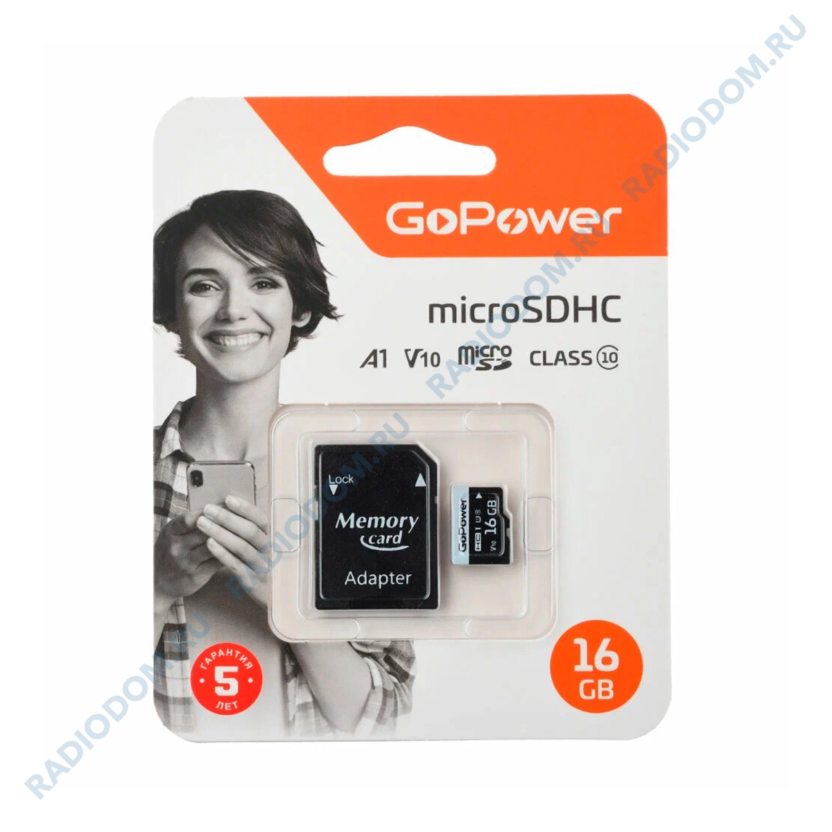 Карта памяти MicroSDHC 16Gb Class 10 V10 +адаптер GoPower
