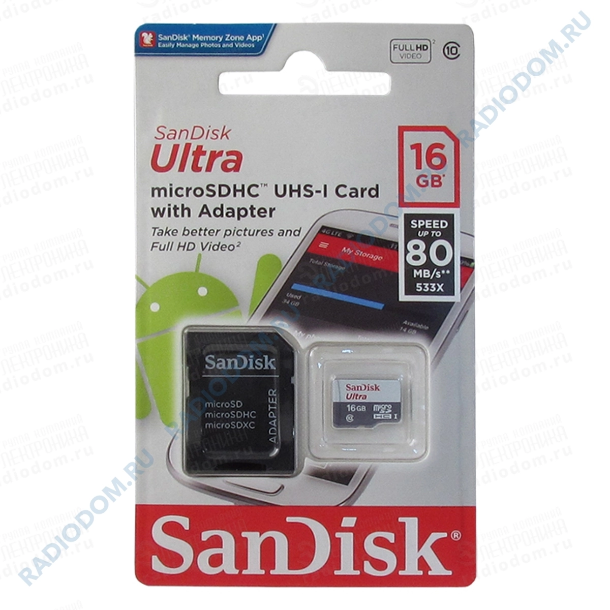 Карта памяти MicroSDHC 16Gb Class 10 Ultra UHS-I U1 адаптер SD SanDisk