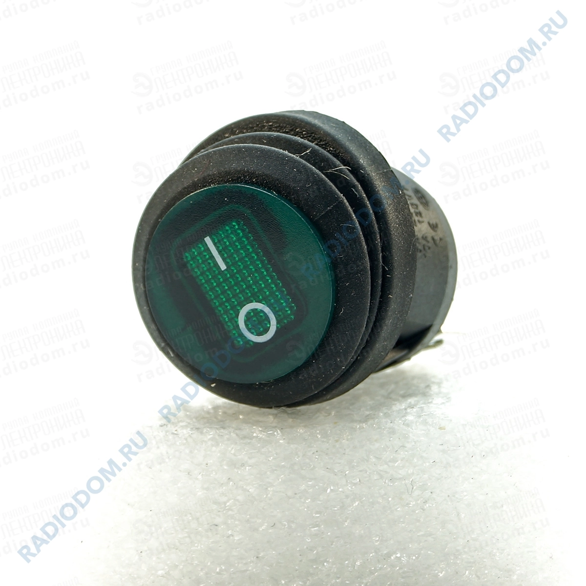 Кнопка с фиксацией круглая 220В R12-777 подсветка зеленая, пыле-влагозащенная 3 контакта