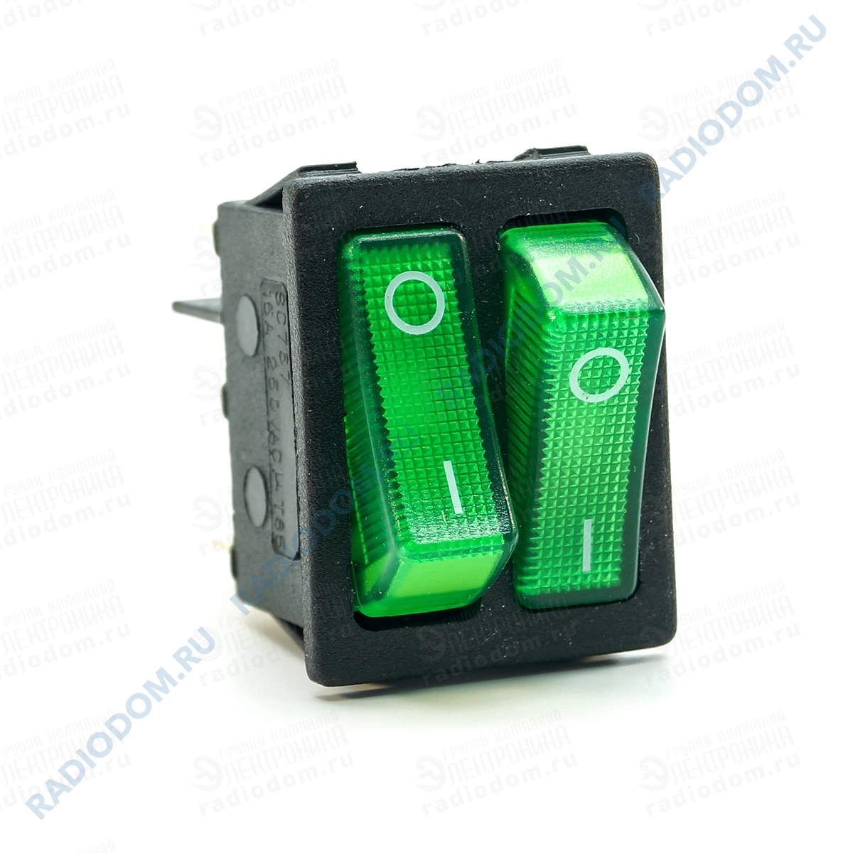 Выключатель 25,6x30,6мм IRS-2101-1C 250В 15A 2 клавиши подсветка зеленая 6 контактов I ∕ O GU0310 SC797 (SC767)