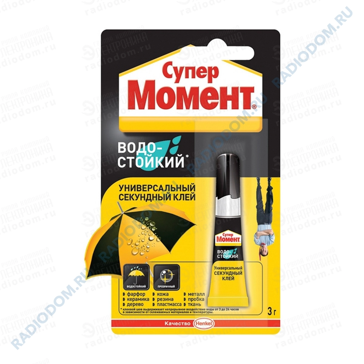 Супер Момент Водостойкий универсальный надежный секундный клей, отличающийся повышенной устойчивостью в влаге. Выдерживает прямое воздействие воды в течение 3-24 часов. Выдерживает прямое воздействие воды в течение 3-24 часов