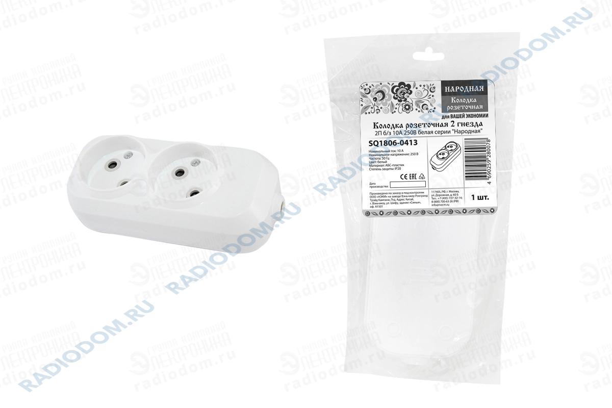 Колодка удлинителя 2 розетки с заземлением 10А белая "Народный" TDM ELECTRIC