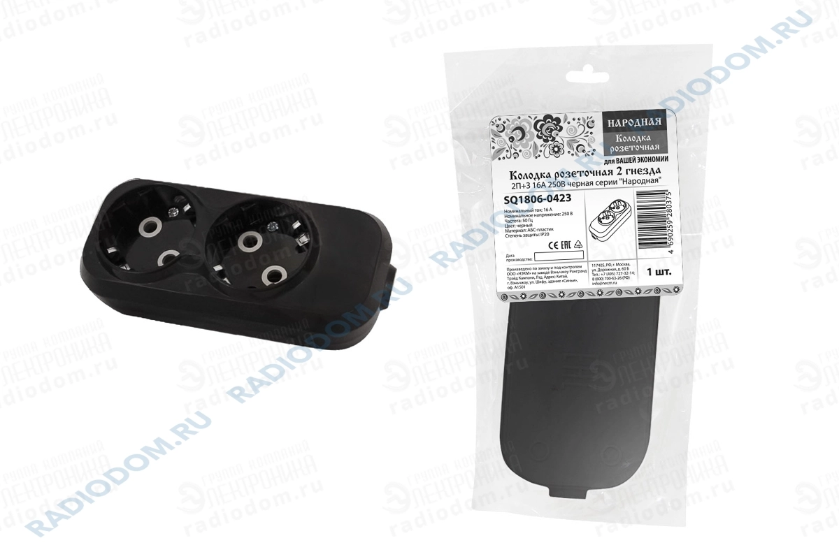 Колодка удлинителя 2 розетки с заземлением 16А черная "Народный" TDM ELECTRIC