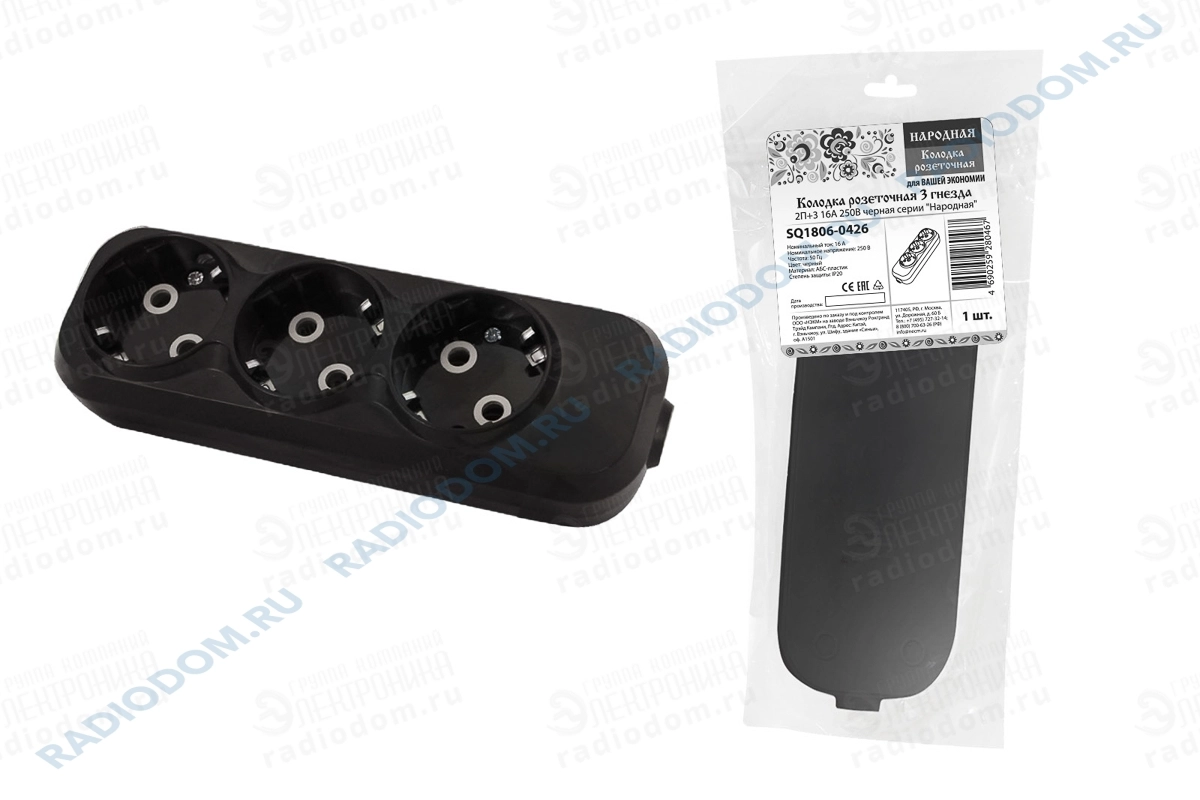 Колодка удлинителя 3 розетки с заземлением 16А черная "Народный" TDM ELECTRIC