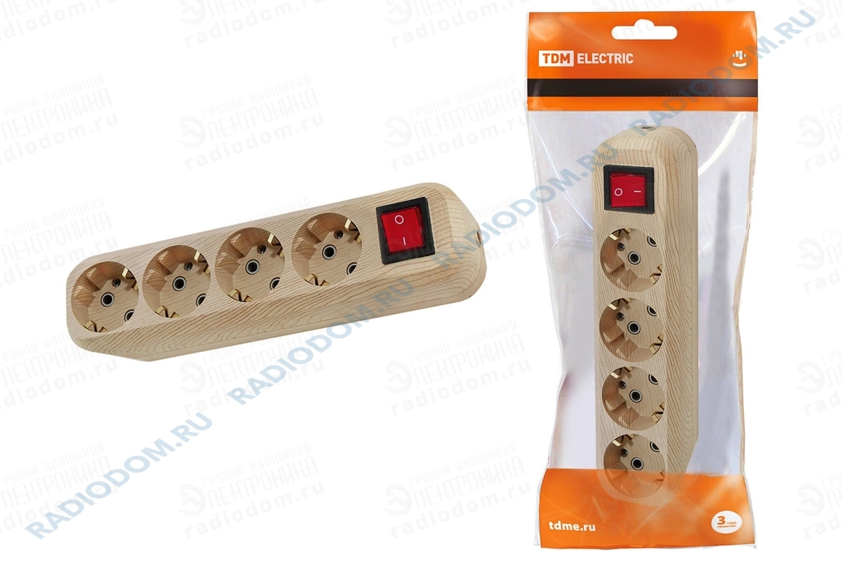 Колодка удлинителя 4 розетки с заземлением с выключателем 16А сосна ЭКО TDM ELECTRIC
