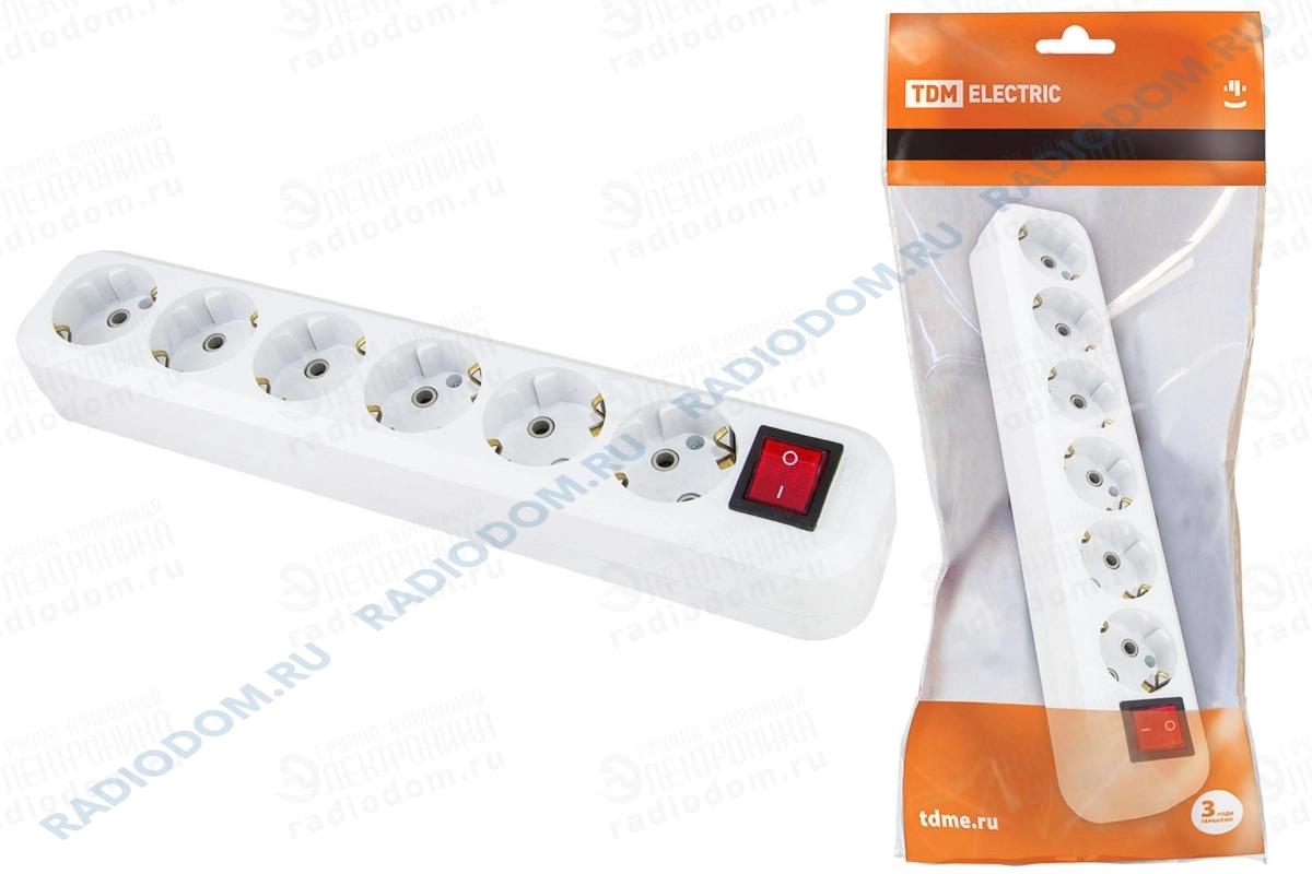 Колодка удлинителя 6 розеток с заземлением с выключателем 16А белая TDM ELECTRIC