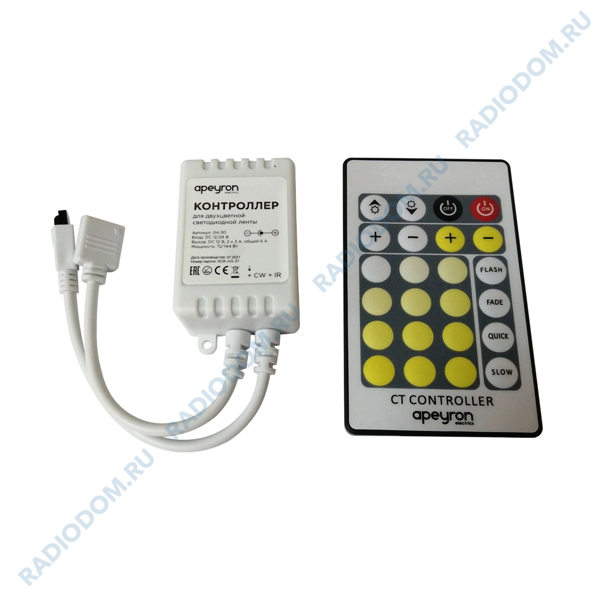 Контроллер CCT 04-30 предназначен для управления светодиодной лентой CCT 12/24 В. С помощью него можно регулировать цветовые оттенки, включать или выключать светодиодную ленту, выбирать различные динамические режимы свечения светодиодной ленты, регулировать яркость. Прибор позволит отрегулировать свечение: создать как свечение бодрящих холодных оттенков, способствующих утреннему пробуждению и концентрации, так и успокаивающих цветов свечения теплых оттенков, которые способствуют успокоению нервной системы и расслаблению. Прибор может работать как от напряжения 12 В, так и 24 В. Прибор укомплектован дистанционным пультом управления, передающий сигнал по инфракрасному каналу. Пластиковый накладной размер 50х28х13 мм. Степень защиты от пыли и влаги соответствует стандарту IP33, что подразумевает установку устройства в сухом, проветриваемом помещении. В комплекте: контроллер, кнопочный ИК-пульт, 4-игольчатый коннектор для выхода.